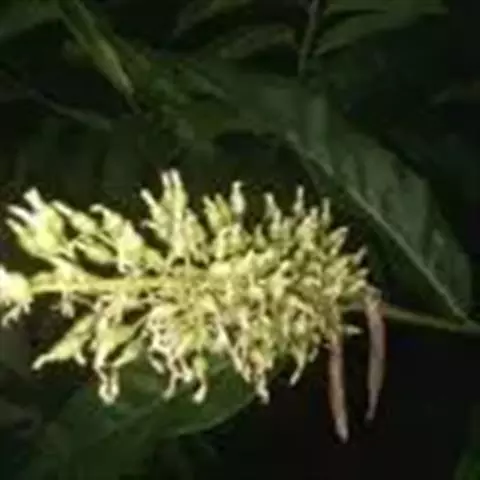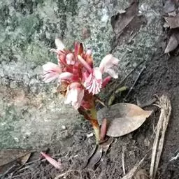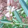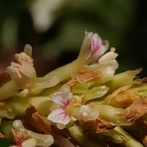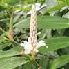 夏季6~7月开花,圆锥形花序,花序下垂,花蕾包藏于总苞片中,花白色,边缘黄色,顶端红色,唇瓣广展,花萼近钟形,花冠白色,花期夏季。