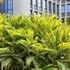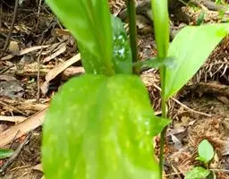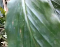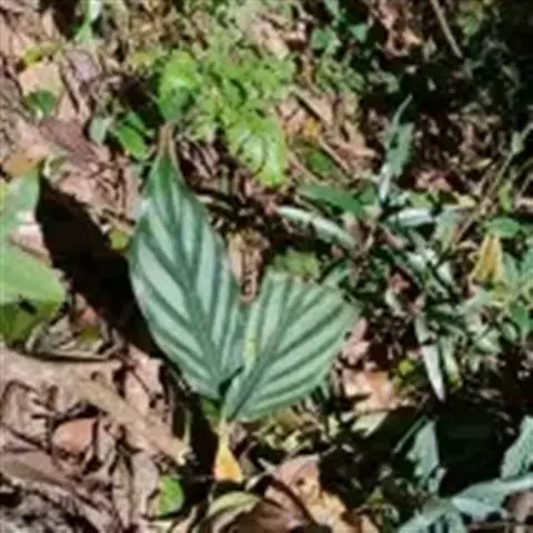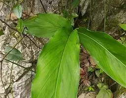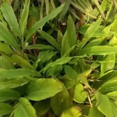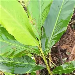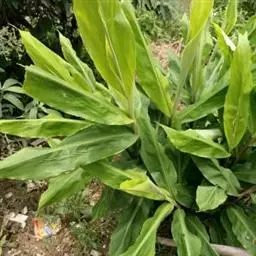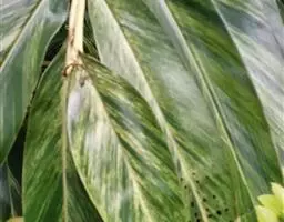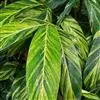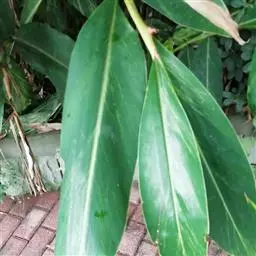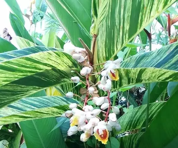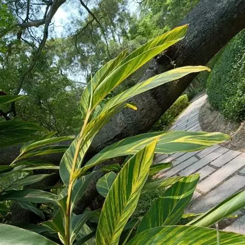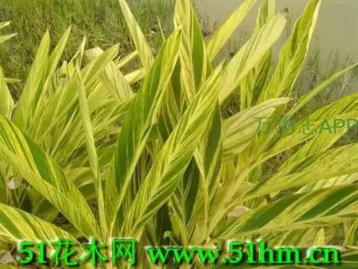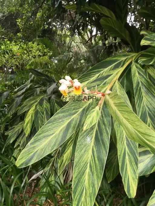 花叶良姜植株高可达1~2m,盆栽高度多在1米以下,具 根茎。革质叶片具鞘,长椭圆形,两端渐尖,叶长约50~60cm,宽约15~20cm,叶面深绿色,有金黄色富有光泽的纵斑纹,十分艳丽。