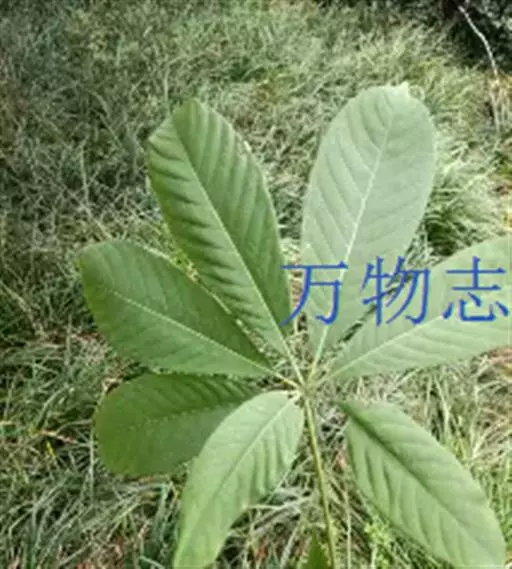 落叶乔木,常高达10余米, 长柄七叶树 树皮灰褐色。小枝圆柱形,淡褐色,无毛,有稀疏的淡黄色近于圆形的皮孔。掌状复叶,有长18-30厘米的叶柄;小叶6-9枚,近于革质,长圆披针形,先端锐尖,基部阔楔形,边缘有紧贴的钝尖形细锯齿,各小叶的大小不等,中间的小叶长20-25(-42)厘米,宽6-12厘米,两侧的小叶较小,约长12-20厘米,常为中间小叶长度的1/2,无毛,上面深绿色,下面淡绿色,干后略带淡紫色;中肋在上面显著,在下面凸起,侧脉23-25对,平斜向伸展,在上面微显著,在下面显著,小叶脉在下面微显著;小叶柄紫色或淡紫色,长5-15毫米。