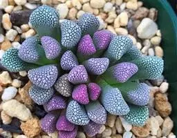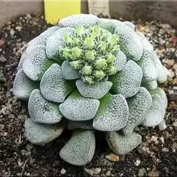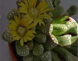 荒玉为番杏科生石花属,原产南非。株体呈白粉色,表面布满凹凸纹路,凹陷处为红褐色,每年秋季开黄花。