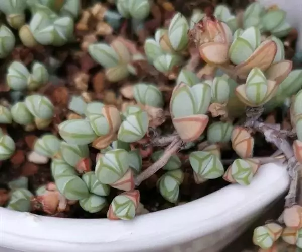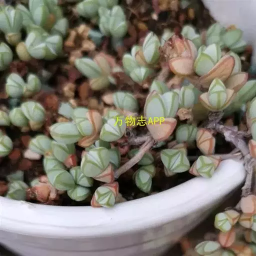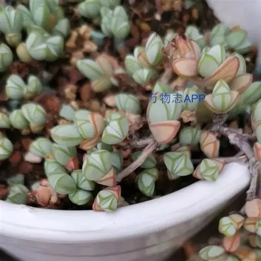 木质茎直立或匍匐,幼茎紫红色,株高可达20厘米;叶交互对生,对 生叶的基部相连并围绕茎,叶片肥厚肉质,略被白粉,叶缘和叶子背部有半透明纹路,叶尖和叶缘在阳光充足的环境中会泛稍紫红色,植株形态和鹿角海棠很相似。小花粉红色或紫红色,盛开在冬末至初春。