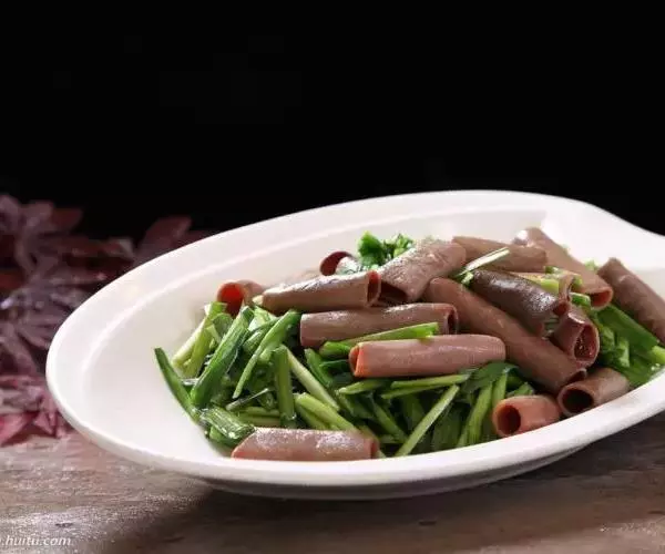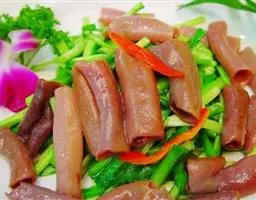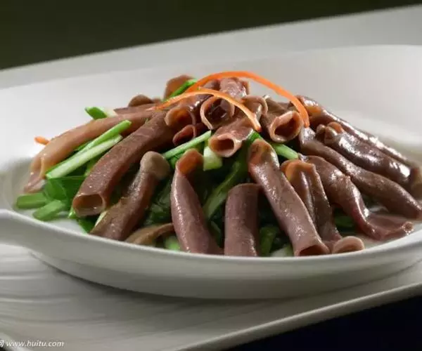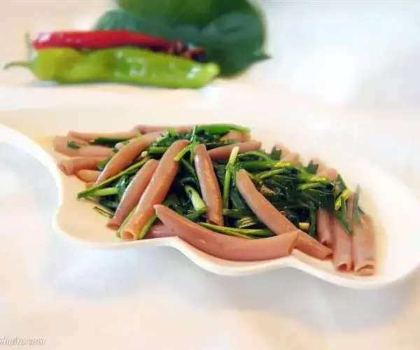 要材料,烹饪以拌菜为主。特色:海肠清脆鲜红,韭菜脆嫩鲜绿,红绿相间,顺色顺味。