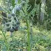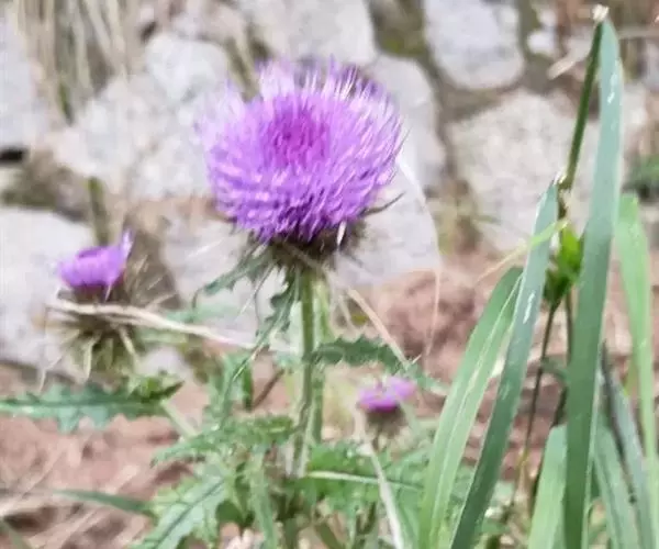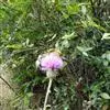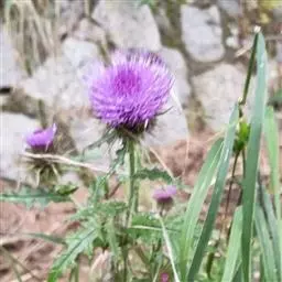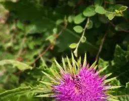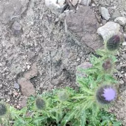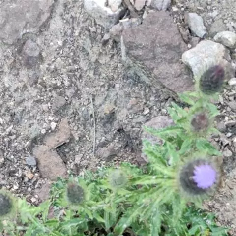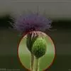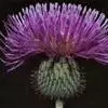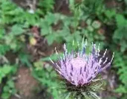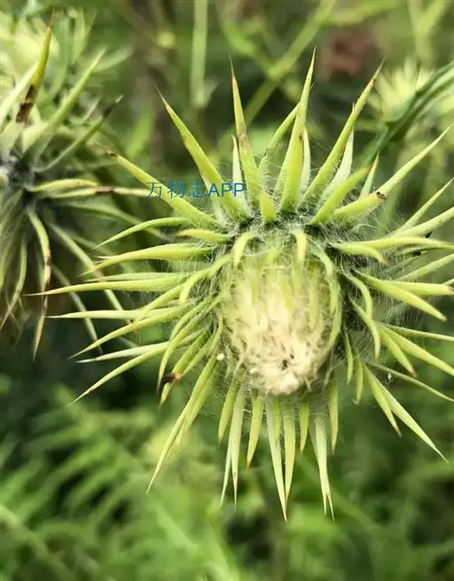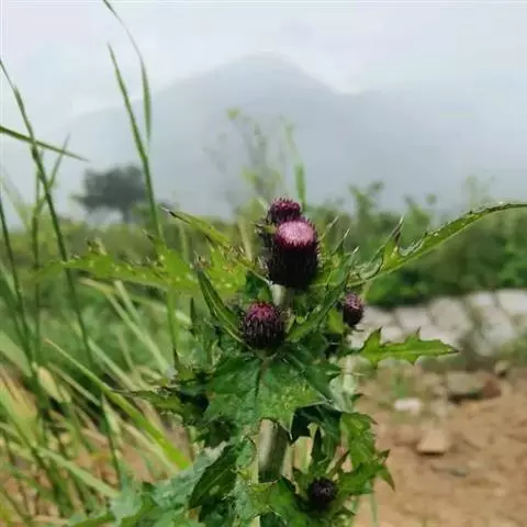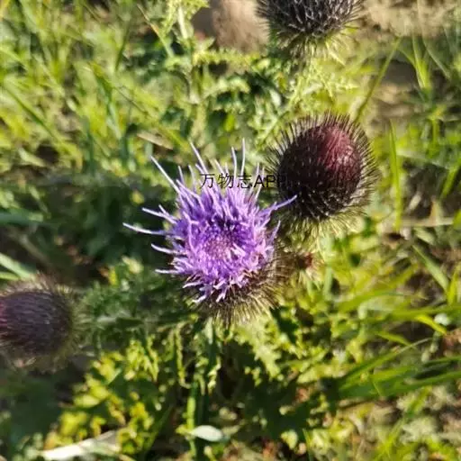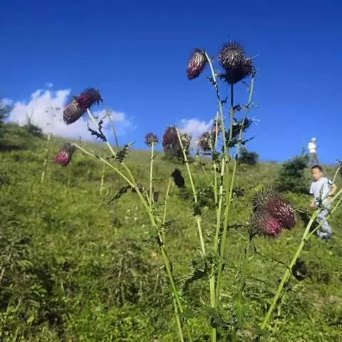 魁蓟,菊科, 蓟属;头状花序单生枝端,直立,总苞宽钟状,有蛛丝状毛。总苞片线装披针形,边缘有小刺,顶端成长尖刺。花冠紫色,长2. 5厘米,管状花的下部狭管部与具裂片的檐部近等长。花期7-9月。