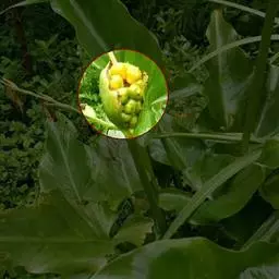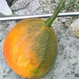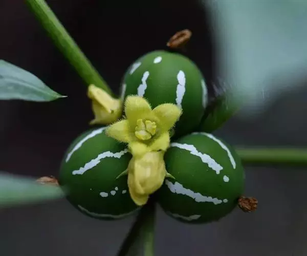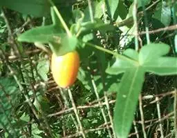 毒瓜 攀援草本;根块状;茎纤细,疏散,有明显的棱沟,光滑无毛。卷须纤细,2歧,无毛。叶柄粗糙,有棱沟,长4-6厘米,被疏散的柔毛;叶片膜质,轮廓宽卵圆形,长、宽均为8-12厘米,掌状5深裂,中间的裂片较长,长圆状披针形,长8-10厘米,宽2-3.5厘米,先端渐尖或钝圆,边缘有疏齿或呈波状,侧面的裂片较短,披针形或长圆状披针形,边缘有齿,基部的2裂片有时具不规则2-3浅裂,叶片基部的弯缺圆形或方形,深0.5-1.5厘米,宽2-2.5厘米,两面粗糙,上面深绿色,背面苍绿色,除脉上明显被柔毛外,近无毛。雌雄同株,雌、雄花常各数朵簇生在同一叶脉。雄花:花梗细,长0.5-1.5厘米,无毛,花萼筒短,长约2毫米,宽5-6毫米,裂片开展,钻形,长约0.5-1毫米;花冠绿黄色,径约7毫米,裂片卵形,长2毫米,宽约0.5-1毫米,先端稍钝,具明显3条脉,两面具小疣点;雄蕊3,1枚1室,2枚2室,花丝离生,极短,长1-1.5毫米,花药卵形,长2毫米,药室折曲。雌花:花萼和花冠与雄花相同;子房卵球形,平滑,近无毛,花柱细,上部3裂,柱头膨大,2裂。果实近无柄,球形,不开裂,直径14-18毫米,果皮平滑,黄绿色至红色,并间以白色纵条纹。种子少数,卵形,褐色,两面凸起,凸起部份厚达1-2毫米,环以隆起的环带,长5毫米,宽3毫米,厚3.5-4毫米。花期3-8月,果期7-12月。 [1-2]
