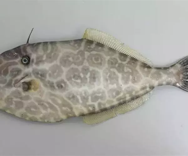 体背侧棕黄色,腹面白色。体具许多不规则褐色斑块和斑点。自吻端经眼至背鳍第至第三鳍棘基底有1条黑褐色斜纹,在第六至第八鳍棘下方有1条垂直宽纹。背侧背鳍基底有4~5个斑块。背鳍、臀鳍和尾鳍均具黑色点斑。胸鳍和腹鳍浅色。
