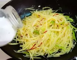 4.炒锅里加少量油,油热后,下青椒丝煸炒到微软时,出锅备用。