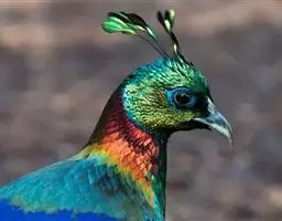 雄鸟全长约140厘米,雌鸟约60厘米。雄鸟头顶、背、胸为金属翠绿色;羽冠紫红色;后颈披肩羽白色,具黑色羽缘;下背棕色,腰转朱红色。飞羽暗褐色。尾羽长,有黑白相间的云状斑纹。腹部白色。嘴和脚蓝灰色。雌鸟上体及尾大部棕褐色,缀满黑斑。胸部棕色具黑斑。