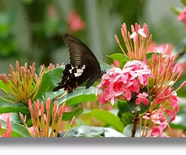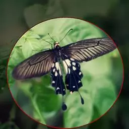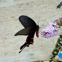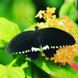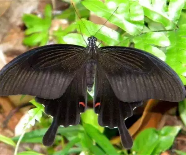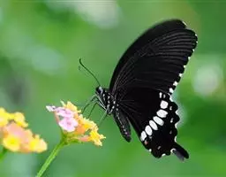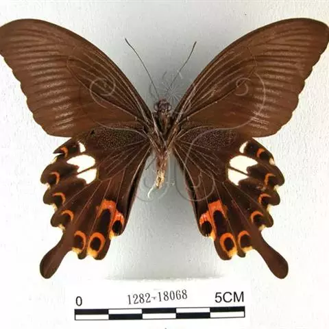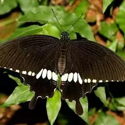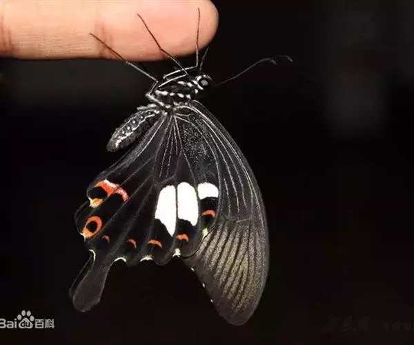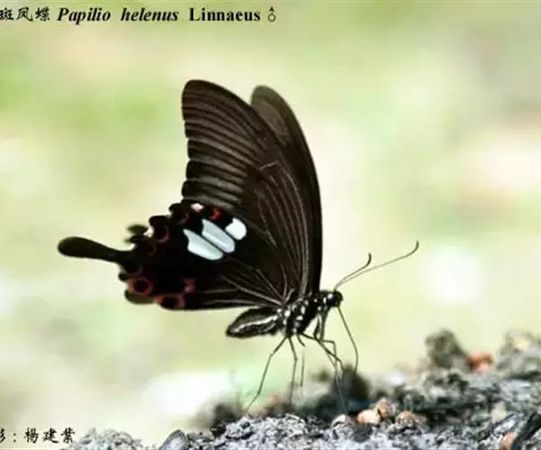 玉斑凤蝶Papilio helenus (Linnaeus, 1758)别名白纹凤蝶,是凤蝶科凤蝶属美凤蝶亚属大型种类。雌雄同型;体翅皆黑色,后翅正面中室外有3个并列的白色斑,亚外缘有1列模糊的新月形红色斑,有尾突1根;后翅反面亚外缘有1列醒目的新月形红斑,臀角处有圆形红色斑1-2个;雌蝶颜色浅褐色。