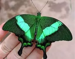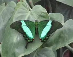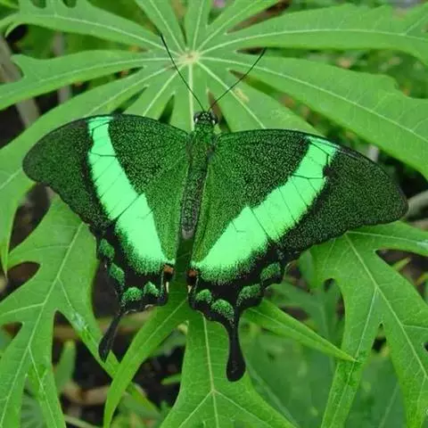 巴黎翠凤蝶中型凤蝶,躯体黑褐色,散布绿色亮鳞。后翅M3脉端有一明显叶状尾突。翅背面底色黑褐色,密布…
