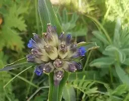 蓝玉簪龙胆(学名:Gentiana veitchiorum Hemsl.)多年生草本,高5-10厘米。根略肉质。花枝多数丛生,黄绿色。叶先端边缘粗糙,叶脉在两面均不明显或仅中脉在下面明显;莲座丛叶发达,线状披针形,花单生枝顶,下部包围于上部叶丛中;无花梗;花萼长为花冠的1/3-1/2,萼筒常带紫红色,筒形,长1.2-1.4厘米,裂片与上部叶同形,花冠上部深蓝色,下部黄绿色。蒴果内藏,椭圆形,先端渐狭,基部钝,柄细;种子黄褐色,有光泽,矩圆形,表面具蜂窝状网隙。花果期6-10月。