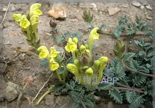 花萼开花时长2毫米,盾片高1.5毫米,均被长柔毛,杂有具柄腺毛,果时花萼长4毫米,盾片高约4毫米。花冠长约2.5-3.3厘米,黄色,或在上唇及下唇侧裂片处带紫,外被疏柔毛及具柄短腺毛;冠筒基部微囊大,宽约1.5毫米,中部以上渐宽,至喉部宽达7毫米;冠檐2唇形,上唇盔状,先端微缺,下唇中裂片宽卵圆形,先端微缺,2侧裂片短小,卵圆形。雄蕊4,前对较长,具能育半药,后对较短,具全药,药室裂口具白色髯毛;花丝丝状,扁平,近无毛。