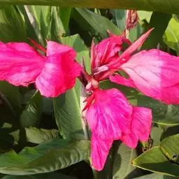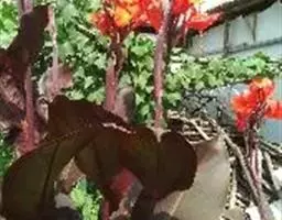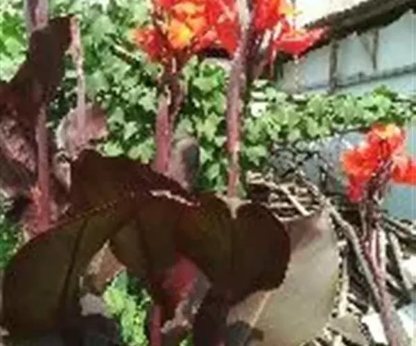 紫叶美人蕉(学名:Canna warszewiczii A. Dietr.):为美人蕉科多年生草本观赏植物。株高1.5米;茎粗壮,紫红色,被蜡质白粉,有很密集的叶。叶片卵形或卵状长圆形,暗绿色,边绿、叶脉多少染紫或古铜色。总状花序超出于叶之上;苞片紫色,卵形,萼片披针形,紫色;唇瓣舌状或线状长圆形,顶端微凹或2裂,弯曲,红色;花期:秋。