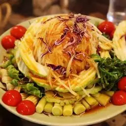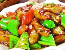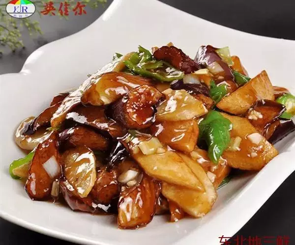 地三鲜(Sauteed Potato、green pepper and eggplant) ,是一道东北传统名菜,制作材料是三种地里时令新鲜的食材:茄子、土豆和青椒。它不仅在于鲜浓的味道、天然绿色的食材,更胜于它涵盖多种食材的营养,让三味非常普通的食材做成鲜爽无比的佳肴。