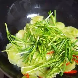 3、 大葱切丝同切削黄瓜的方法,将葱白切成长丝备用。