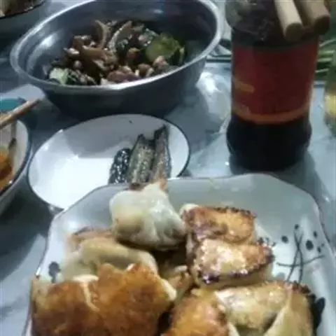 4、取一平底锅,热锅后倒入少许色拉油,将饺子放入小火煎至底部焦黄,然后倒入用面粉或者淀粉与水调和的水至饺子1/3处,盖上盖子用小火煮煎,待煮至水快收干淋入少许香油待收干即可