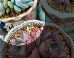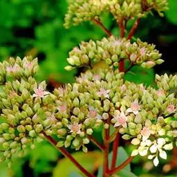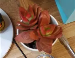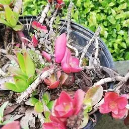 叶子表面宽厚,富肉质感且带有磨纱质感,看像石头质地;开红色小花,生于植株顶部,倒伞形密生,形状像花…