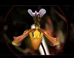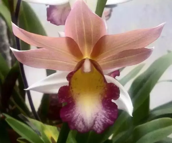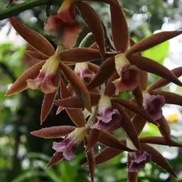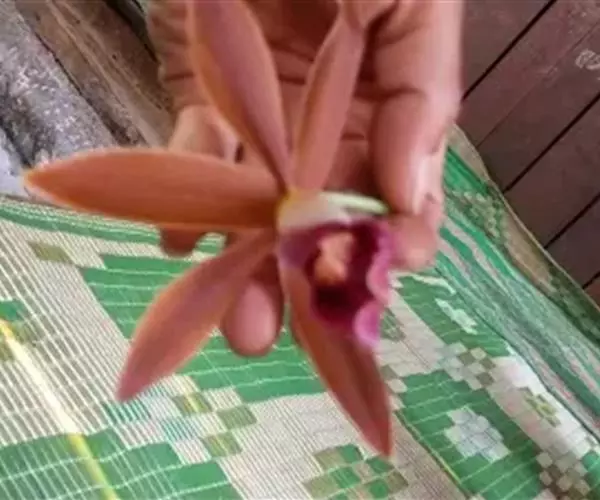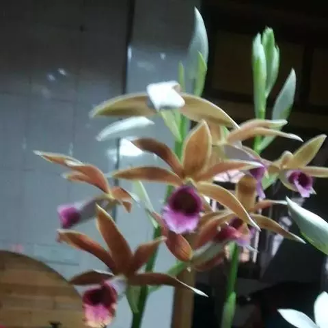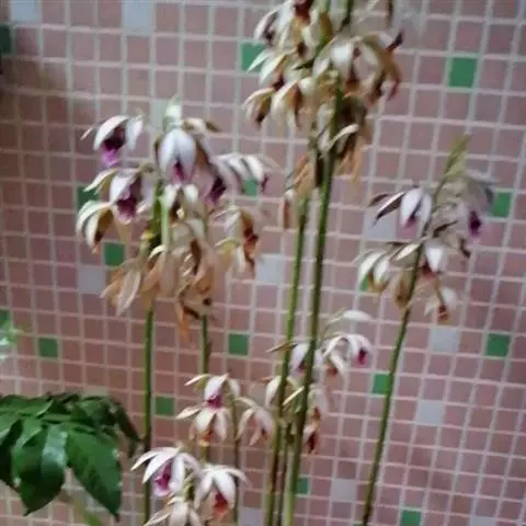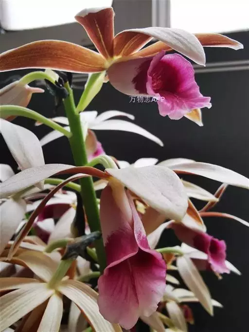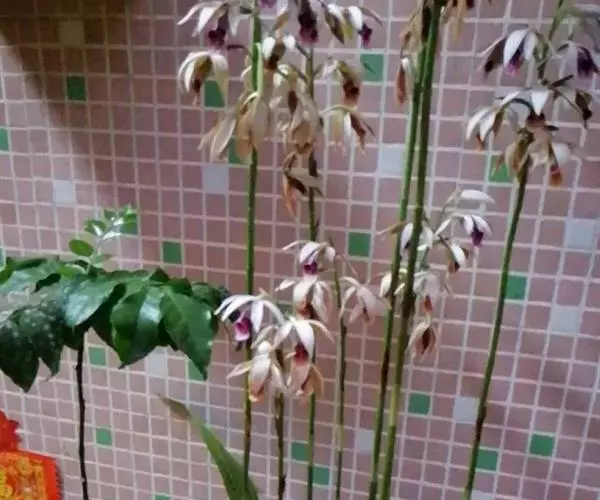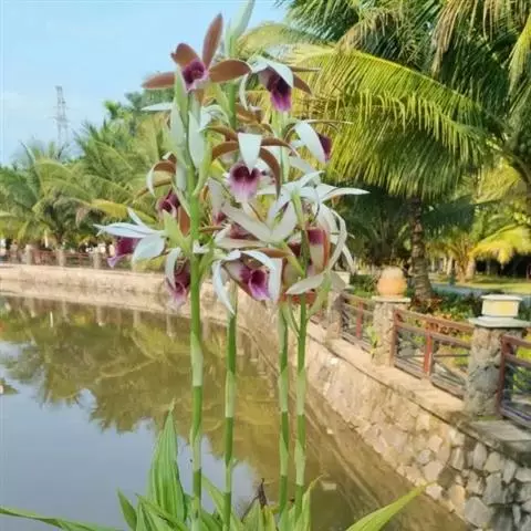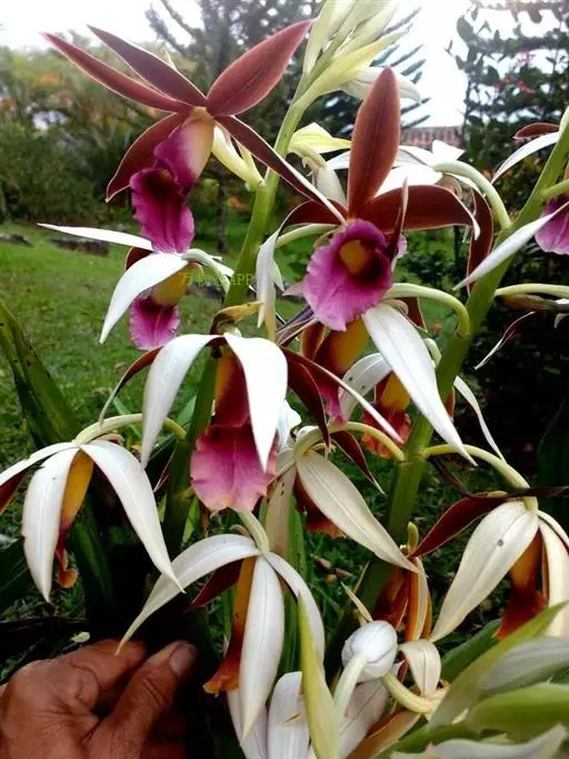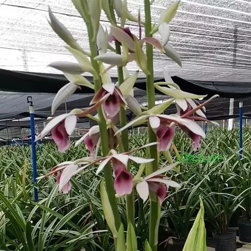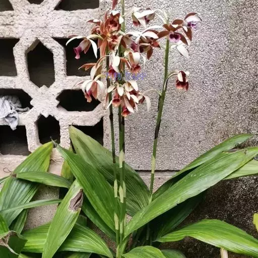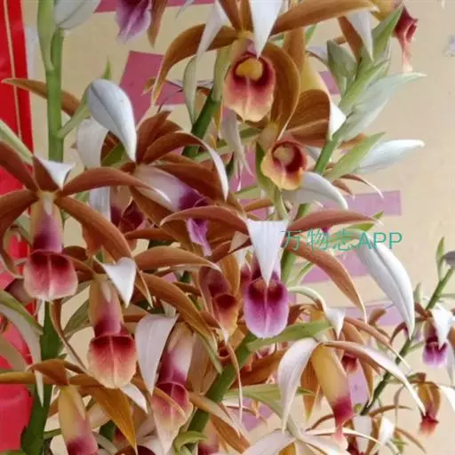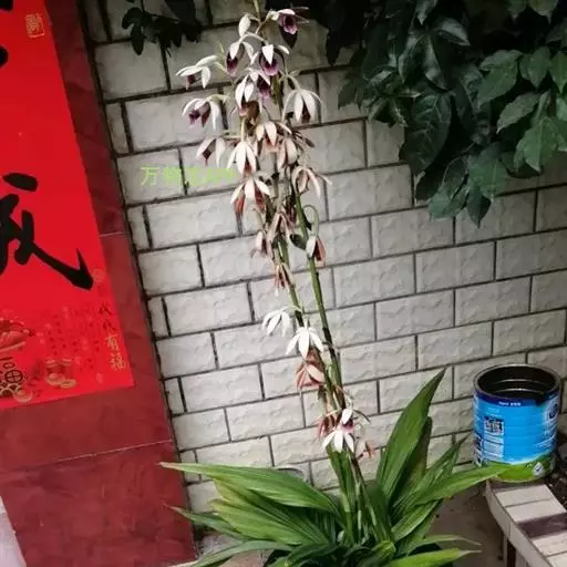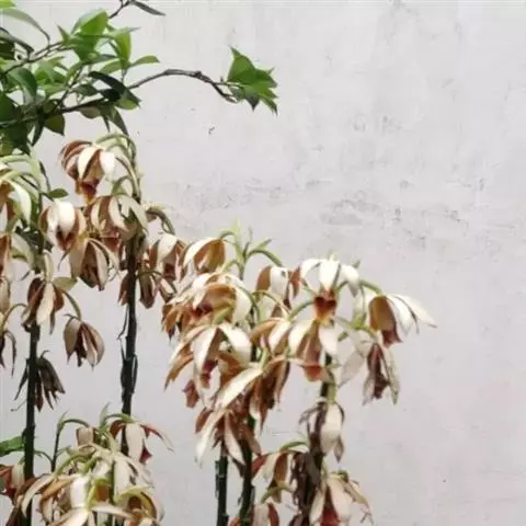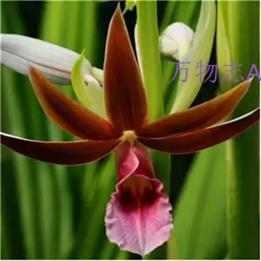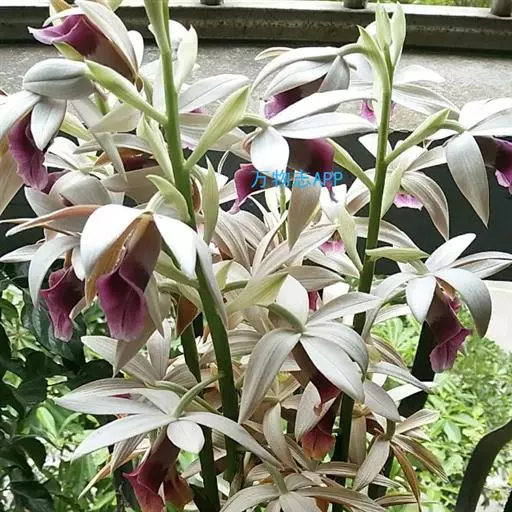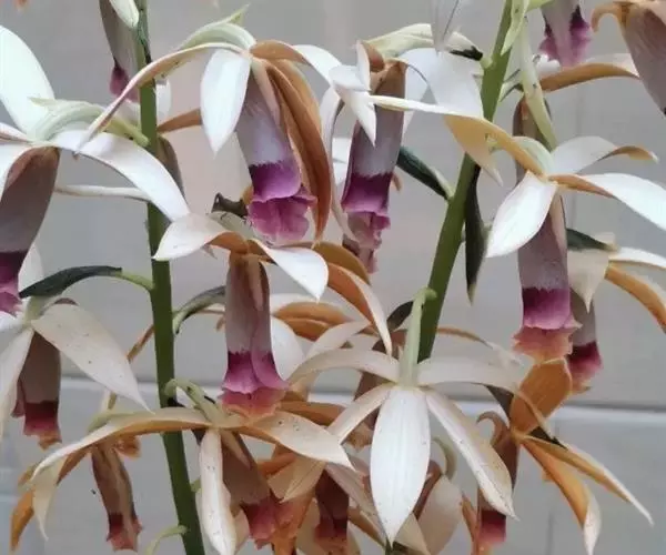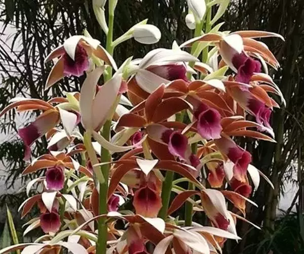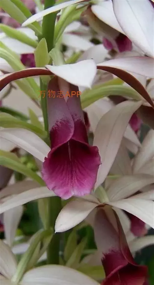 花葶从假鳞茎基部或叶腋发出,直立,圆柱形,长达1米,粗约1厘米,疏生数枚大型的鳞片状鞘,无毛;总状花序具多数花;花苞片大,膜质,通常早落,舟形,比花梗和子房长,先端急尖,无毛;花梗和子房长3-4厘米;子房稍扩大,无毛;花大,美丽,背面白色,内面暗赭色或棕色,直径7-10厘米;萼片近相似,长圆状披针形,长4-6厘米,宽约1厘米,先端短渐尖,具7条脉,无毛。