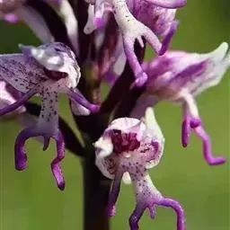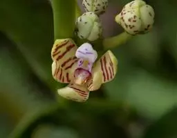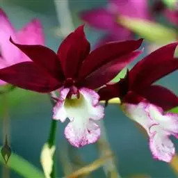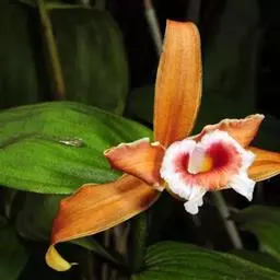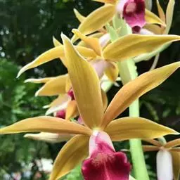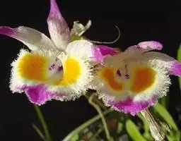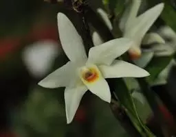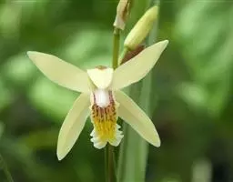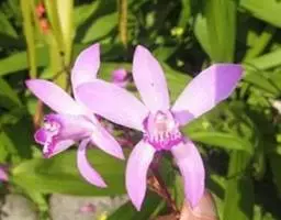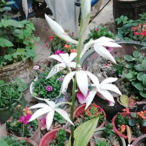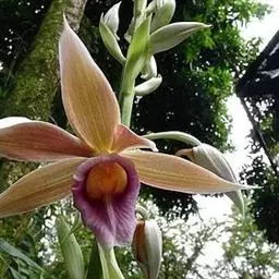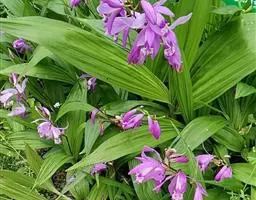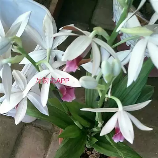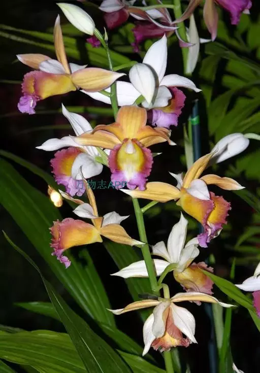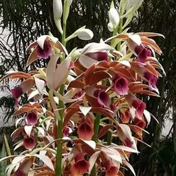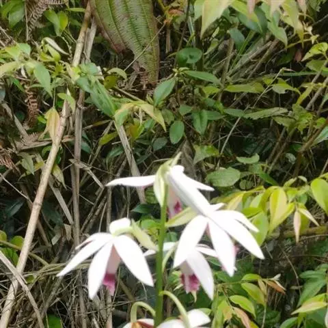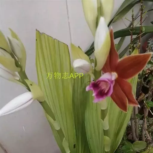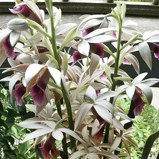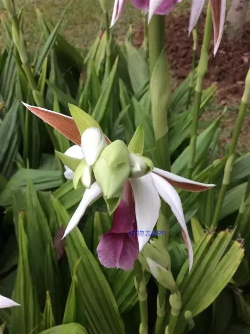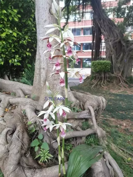 鹤顶兰(学名:Phaius tankervilleae (Banks ex L'Herit. ) Bl.):植物体高大。假鳞茎圆锥形,长约6厘米或更长。叶2-6枚,互生于假鳞茎的上部,长圆状披针形,两面无毛。花葶从假鳞茎基部或叶腋发出,直立,圆柱形,长达1米,粗约1厘米,疏生数枚大型的鳞片状鞘,无毛;总状花序具多数花;花大,美丽,背面白色,内面暗赭色或棕色,直径7-10厘米;花瓣长圆形,与萼片等长而稍狭,先端稍钝或锐尖,具7条脉,但近边缘的脉分枝,无毛;唇瓣贴生于蕊柱基部,背面白色带茄紫色的前端,内面茄紫色带白色条纹,摊平后整个轮廓为宽菱形或倒卵形,比萼片短,宽3-5厘米,中部以上浅3裂。花期3-6月。