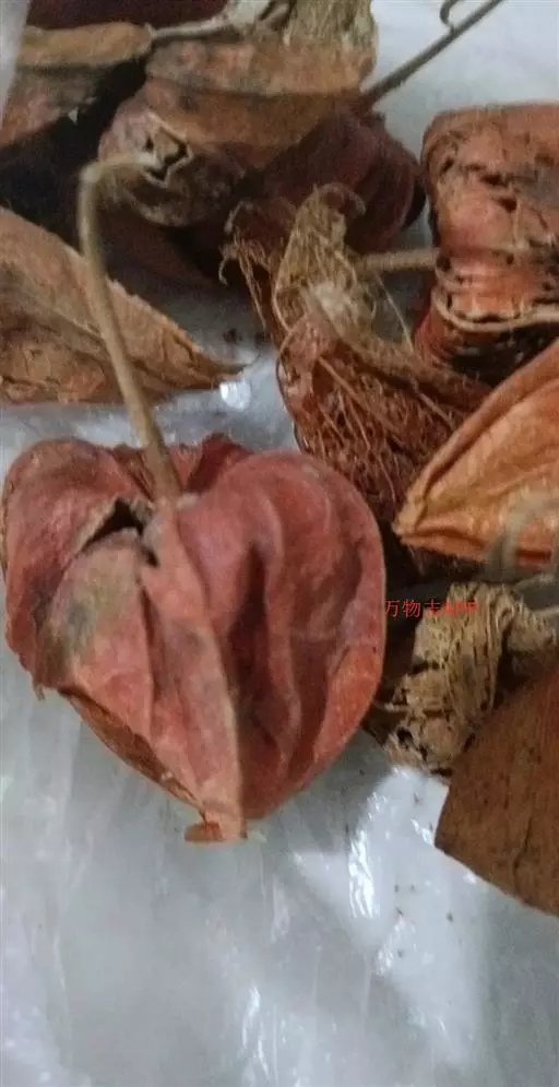 果梗长约2-3cm,多少被宿存柔毛;果萼卵状,长2.5-4cm,直径2-3.5cm,薄革质,网脉显著,有10纵肋,橙色或火红色,被宿存的柔毛,顶端闭合,基部凹陷;浆果球状,橙红色,直径10-15mm,柔软多汁。种子肾脏形,淡黄色,长约2mm。花期5-9月,果期6-10月。