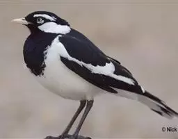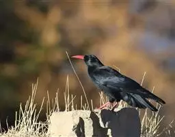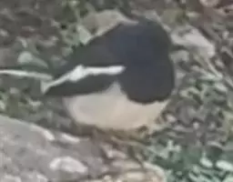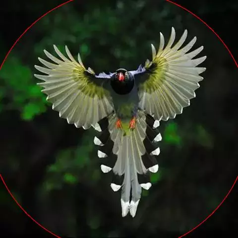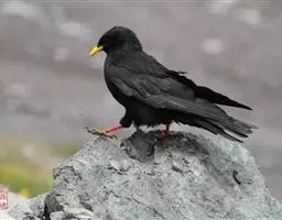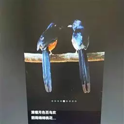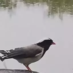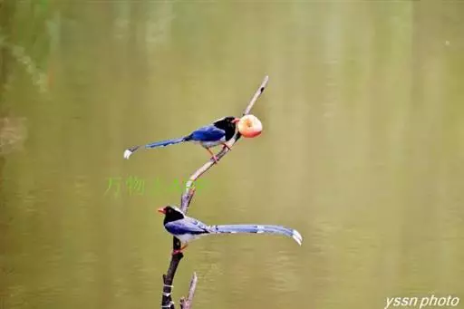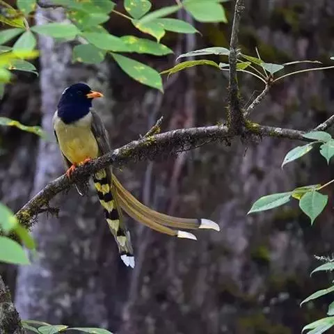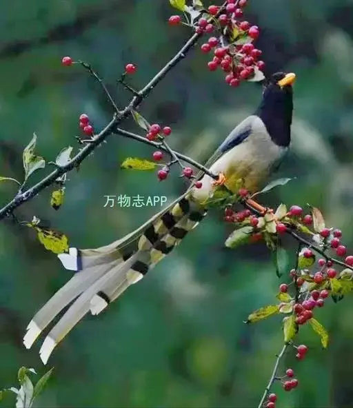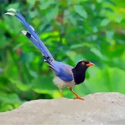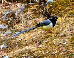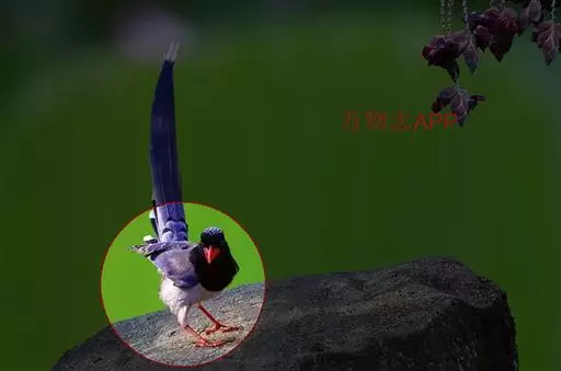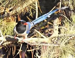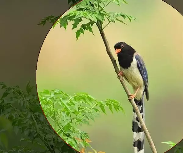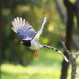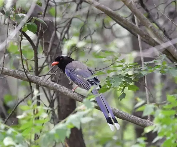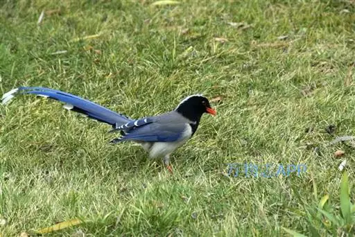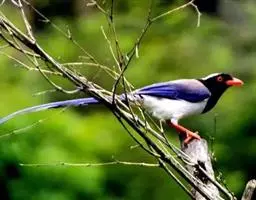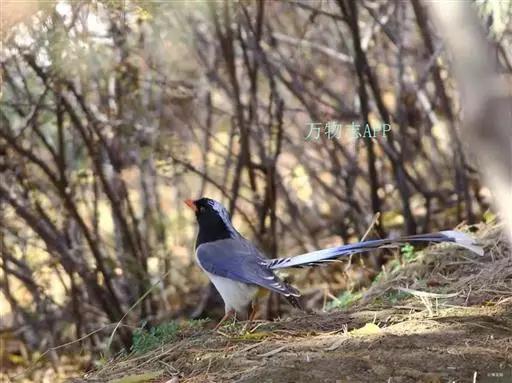 红嘴蓝鹊(学名:Urocissa erythrorhyncha) :是大型鸦类,体长54-65厘米。嘴、脚红色,头、颈、喉和胸黑色,头顶至后颈有一块白色至淡蓝白色或紫灰色块斑,其余上体紫蓝灰色或淡蓝灰褐色。尾长呈凸状具黑色亚端斑和白色端斑。下体白色。 黄嘴蓝鹊外形和羽色和该种非常相似,但黄嘴蓝鹊嘴为黄色,头部仅枕有白色块斑。区别仍很明显,野外不难识别。