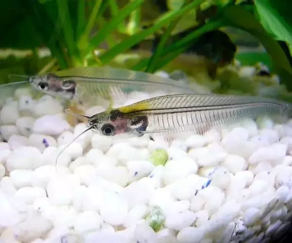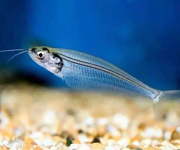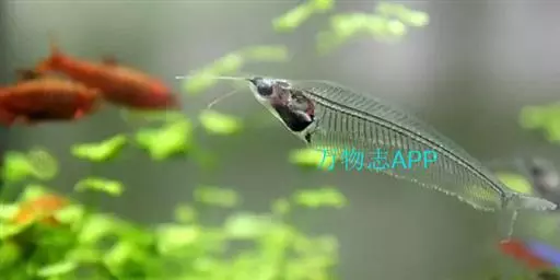 玻璃猫鱼身长10~12厘米,形似一片柳叶。头吻尖, 口上有长触须2根,常前伸或自由转动,探测水流、敌情、障碍和协助觅食。胸腹极短,头胸腹部只占全长的1/4。