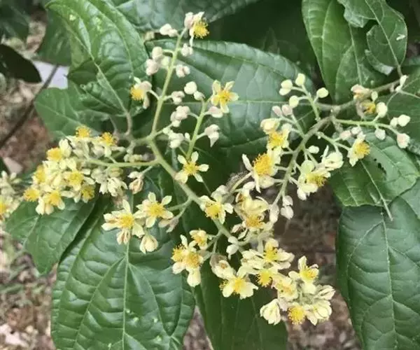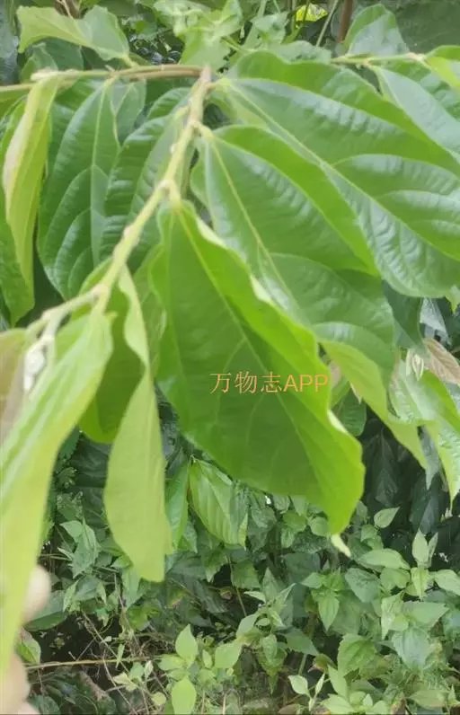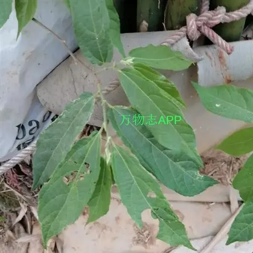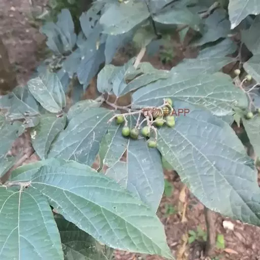 幼枝被毛。叶薄革质,卵状长圆形,长8-18厘米,先端渐尖,基部ff初两面被星状柔毛,后脱落无毛,3出脉的两侧脉由基部生出,向上过中部,边缘有细锯齿;叶柄长1-1.5厘米,托叶线状披针形,长5-7毫米。