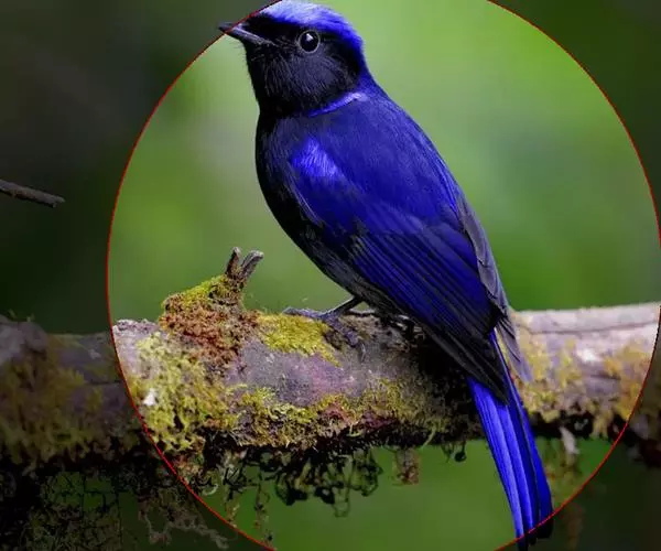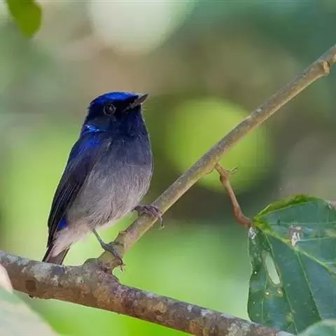 小仙鹟前部额基、眼先、耳羽、眼周黑色,前额、头顶两侧眉区、腰、尾上覆羽和颈侧块斑辉钴蓝色,头顶至后颈、背、肩、两翅和尾表面概为紫蓝色或深蓝色,翅上大覆羽和飞羽褐色或黑褐色、具窄的暗蓝色或紫蓝色羽缘。颏、喉和上胸黑色或深紫蓝色,下胸暗灰色,腹、两胁淡灰色,腹和尾下覆羽淡灰色或白色,腋羽和翼下覆羽白色。