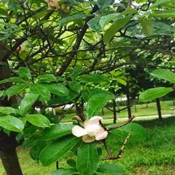 落叶乔木, 高10m。叶长10~20cm,宽4~9cm,叶缘呈波形:托叶痕达叶柄中部以上。花单生叶腋,酪黄色,极芳香。