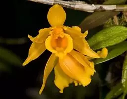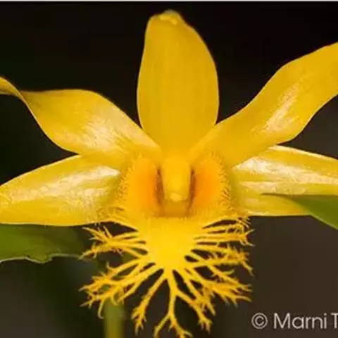 总状花序顶生,花序轴长5-7毫米,具12朵花;花序柄长2-3毫米;花苞片膜质,卵状披针形,长7-10毫米;花梗和子房长约2.5厘米;花开展,除唇瓣的中裂片金黄色和侧裂片的内面橘红色外,均为白色;中萼片卵状披针形,长约2.5厘米,宽约1厘米,先端急尖,具7条脉;侧萼片斜卵状披针形,长2.5厘米,宽1厘米,先端急尖,具7-8条脉;萼囊宽圆锥形,长约1厘米;花瓣倒卵形,花径2-3厘米,白色。