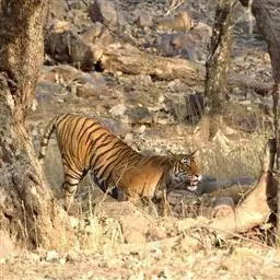 在印度的纳加尔霍雷国家公园,孟加拉虎食谱里22.8%是斑鹿、水鹿占11.4%、野牛占7.5%、野猪和赤麂分别占8.4%、长尾叶猴占11.3%、斑鼷鹿占13.6%、兔占1.5%、豪猪占0.6%、豺占1%,还有13.5%未辨明种类。