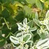 银边翠 一年生草本。根纤细,极多分枝,长可达20厘米以上,直径3-5毫米。茎单一,自基部向上极多分枝,高可达60-80厘米,直径3-5毫米,光滑,常无毛,有时被柔毛。叶互生,椭圆形,长5-7厘米,宽约3厘米,先端钝,具小尖头,基部平截状圆形,绿色,全缘;无柄或近无柄;总苞叶2-3枚,椭圆形,长3-4厘米,宽1-2厘米,先端圆,基部渐狭。全缘,绿色具白色边;伞幅2-3,长1-4厘米,被柔毛或近无毛;苞叶椭圆形,长1-2厘米,宽5-7(9)毫米,先端圆,基部渐狭,近无柄花序单生于苞叶内或数个聚伞状着生,基部具柄,柄长3-5毫米,密被柔毛;总苞钟状,高5-6毫米,直径约4毫米,外部被柔毛,边缘5裂,裂片三角形至圆形,尖至微凹,边缘与内侧均被柔毛;腺体4,半圆形,边缘具宽大的白色附属物,长与宽均超过腺体。雄花多数,伸出总苞外;苞片丝状;雌花1枚,子房柄较长,长达3-5毫米,伸出总苞之外,被柔毛;子房密被柔毛;花柱3,分离;柱头2浅裂。蒴果近球状,长与直径均约5.5毫米,具长柄,长达3-7毫米,被柔毛;花柱宿存;果成熟时分裂为3个分果爿。种子圆柱状,淡黄色至灰褐色,长3.5-4毫米,直径2.8-3毫米。被瘤或短刺或不明显的突起;无种阜。花果期6-9月。