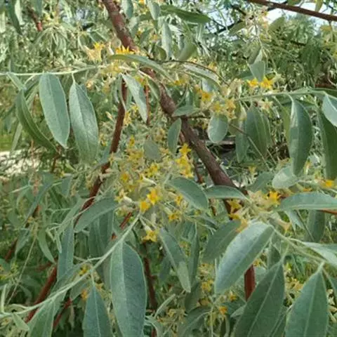 沙枣,别名:七里香、香柳、刺柳、桂香柳、银柳、银柳胡颓子、牙格达、红豆、则给毛道、给结格代,拉丁文名:(Elaeagnus angustifolia Linn. ) 胡颓子科、胡颓子属落叶乔木或小乔木,高5-10米,无刺或具刺,刺长30-40毫米,棕红色,发亮;幼枝密被银白色鳞片,老枝鳞片脱落,红棕色,光亮。叶薄纸质,矩圆状披针形至线状披针形,顶端钝尖或钝形,基部楔形,全缘,上面幼时具银白色圆形鳞片,成熟后部分脱落,带绿色,下面灰白色,密被白色鳞片,有光泽,侧脉不甚明显;叶柄纤细,银白色,果实椭圆形,粉红色,密被银白色鳞片;果肉乳白色,粉质;果梗短,粗壮,花期5-6月,果期9月。