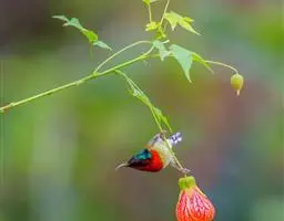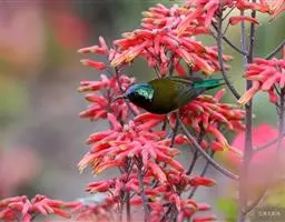 叉尾太阳鸟,雀形目太阳鸟科太阳鸟属留鸟;为小型鸟类,雄鸟头顶辉蓝绿色,上体橄榄绿色,腰明黄色,…