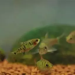 索姆三角灯鱼,学名为红身三角波鱼(Trigonostigmasomphongsi)。成鱼体长仅 三角灯鱼 达2cm左右,乃是三角灯鱼中体型最小的一个品种。整个鱼的外观呈一个纺锤的形状,背鳍、腹鳍、臀鳍以及尾鳍均为透明色,从胸腹部位至尾鳍有一条较为笔直的黑色横纹,周围的鱼鳞为金黄色,逐渐向四周隐没淡化。鱼身上半部分为略微透明的淡青色,鱼眼也为青色。索姆三角灯鱼整体色彩还是比较明媚鲜艳的,亮丽的金黄色搭配小巧灵敏的鱼身,具有一定观赏性的同时亦十分耐看。