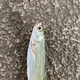 体延长,侧扁。体前部呈银灰色,背部青黑色,腹部乳白色;体后半部两 侧由背鳍前端下方与腹鳍前端连线开始直至尾柄部,有三角形蓝色斑块或由 不同大小的黑色斑纹组成的三角形斑块。背鳍、臀鳍、尾鳍均为淡红色。
