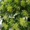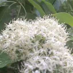 伞房状聚伞花序顶生,被灰白色贴生短柔毛,宽3.5-8厘米;总花梗圆柱形,长1.5-4厘米,略有稜角,密被贴生灰白色短柔毛;花小,白色至淡黄白色,直径9-10毫米;花萼裂片4,披针状三角形至尖三角形,长1毫米,长于花盘,淡绿色,外侧被紧贴的短柔毛;花瓣4,狭卵形至披针形,长6毫米,宽1.8毫米,先端急尖,质地稍厚,上面无毛,下面有贴生短柔毛:雄蕊4,长5毫米,花丝淡白色,长4毫米,无毛,花药长圆卵形,2室,淡黄白色,长2.4毫米,丁字形着生;花盘垫状,略有浅裂,厚约0.2毫米;子房下位,花托倒卵形,长2毫米,直径1.6毫米,密被灰白色平贴短柔毛,花柱棍棒形,长3.5毫米,淡黄白色,近于无毛,柱头小,截形,略有3(-4)个小突起;花梗细.圆柱形,长2-9毫米,被灰色及少数褐色贴生短柔毛。