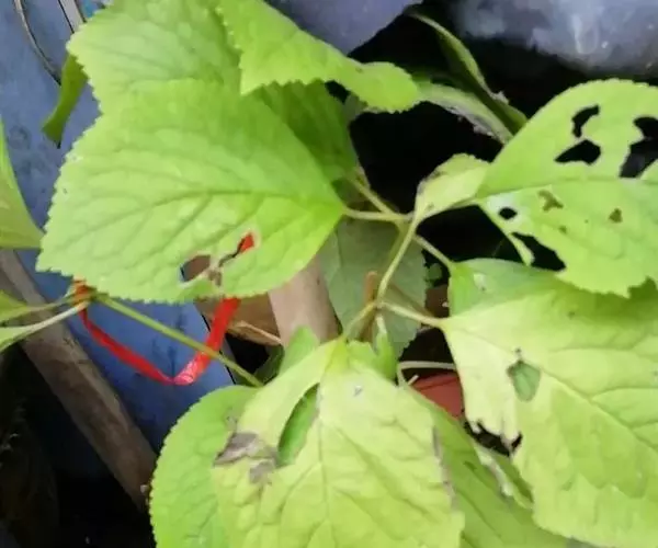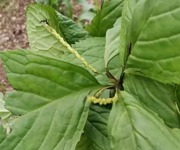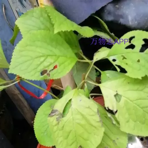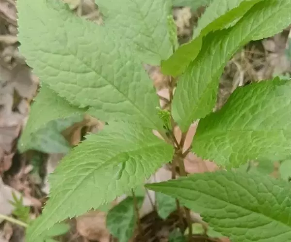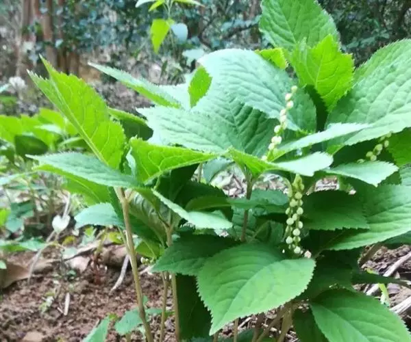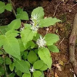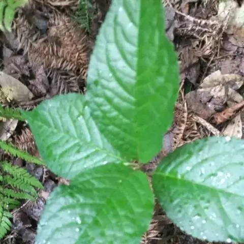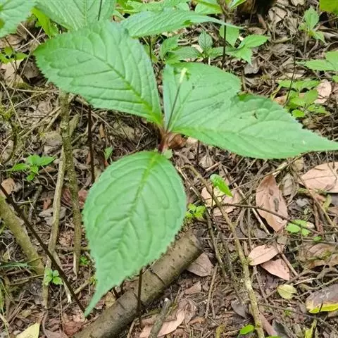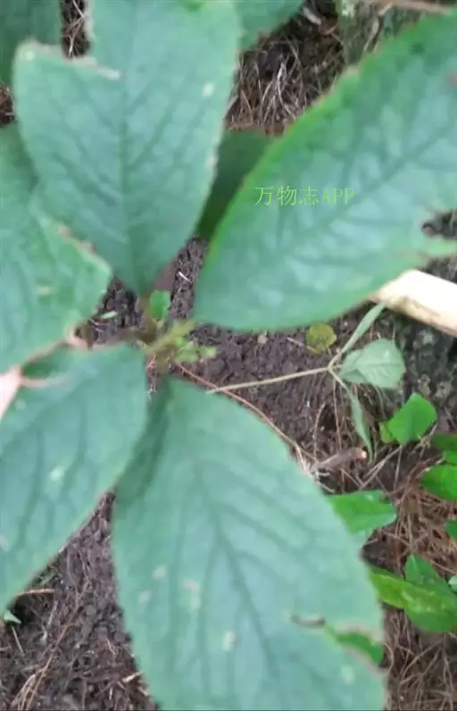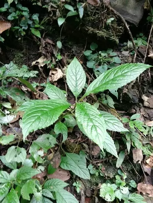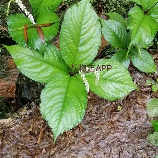 及己属多年生草本,高约30厘米。茎圆形,无毛。叶对生,4—6片,生于茎上部,卵形或卵状披针形,长4—8厘米,宽2.5—6厘米,顶端渐尖,基部楔形或阔楔形,边缘有圆锯齿,齿尖有1腺体。穗状花序单生或2—3分枝,长4—5厘米;苞片近半圆形,顶端有波状小齿;雄蕊3,下部合生,白色,中间一个雄蕊较长,花药2室,侧生的2个较短,花药l室;子房卵形。核果梨形,长约2毫米。花果期4—6月。
