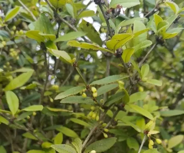 常绿灌木,高1-3米。老枝黄褐色或灰褐色,幼枝淡黄色,具条棱和稀疏黑色疣点;茎刺粗壮,三分叉,腹面具槽,与枝同色,长1-4厘米。叶革质,椭圆形,披针形或倒披针形,长3-10厘米,宽1-3厘米,先端渐尖,基部楔形,上面深绿色,中脉凹陷,侧脉微显,背面淡绿色,中脉隆起,侧脉微隆起或不显,两面网脉不显,不被白粉,叶缘平展,每边具10-20刺齿;叶柄长1-4毫米。花10-25朵簇生;花梗长8-15毫米;花黄色;小苞片卵形,长约2.5毫米,宽约1.5毫米,先端急尖;萼片2轮,外萼片卵形,长约5毫米,宽约3毫米,先端急尖,内萼片长圆状椭圆形,长约7毫米,宽约4毫米,先端圆钝;花瓣长圆状椭圆形,长约6毫米,宽约3毫米,先端缺裂,基部缢缩呈爪,具2枚长圆形腺体;胚珠单生。浆果长圆形,蓝黑色,长7-8毫米,直径3.5-4毫米,顶端具明显宿存花柱,被白粉。花期3月,果期5-11月。