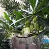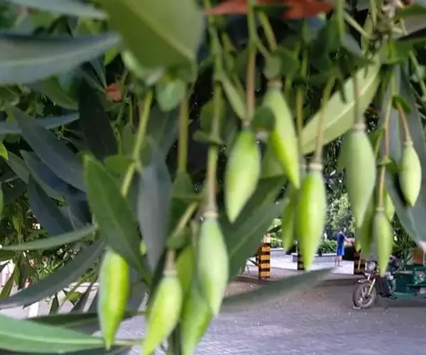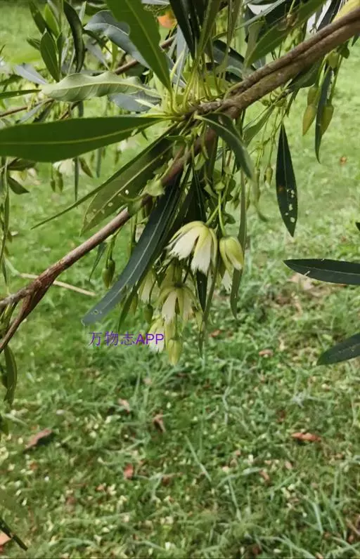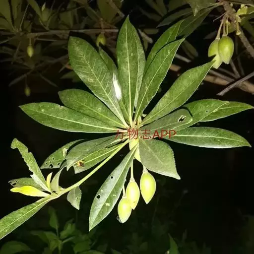核果纺锤形,两端尖,长约4cm,中央宽1-1.2cm;内果皮坚骨质,表面有浅沟,腹缝线2条,厚1.5mm,1室;种子长2cm。花期6-7月。