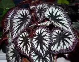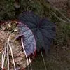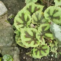 由漆斑菌引起的秋海棠叶斑病症状: 昌感秋海棠 Begonia cavaleriei 病症一般出现在秋海棠叶片边缘、叶尖和破损叶片的叶脉上。坏死区域呈现黑褐色,然后是水渍状。诊断方法是下部的叶片经常会不规则形状的孢子群,中央呈黑色,但边缘为白色。
