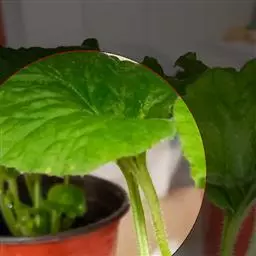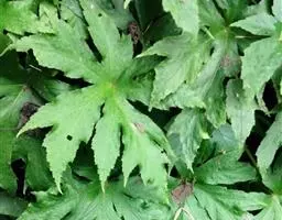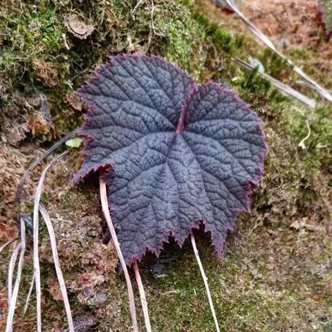 叶盾形,全部基生,具长柄;叶片厚纸质,两侧略不相等,轮廓近圆形,长8-15(22)厘米,宽5-13 (-19)厘米,先端渐尖至长渐尖,基部略偏呈圆形,窄侧宽1.5-4.8厘米,宽侧宽3-7厘米,边全缘常带浅波状,上面褐绿色,被极短之毛,老时脱落,下面淡褐绿色,近无毛,脉自叶柄顶端放射状发出,6-8条,下面粗而明显,并呈淡红褐色,中部以上分叉;叶柄长7-25厘米,有棱,无毛;托叶早落。