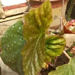 细菌性病害由斑点病菌引起的叶斑病症状:秋海棠非常容易被该种菌所侵染,但是许多生产者对之没有足够的重视,并不认为这是一种病症,因为叶片边缘坏死和叶片斑点是最常见的,几乎所有类型的秋海棠都曾经出现过这种情况。