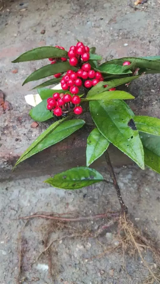 小灌木或亚灌木,近蔓生,具匍匐生根的根茎;直立茎长达30厘米,稀达40厘米,不分枝, 紫金牛(图1) 幼时被细微柔毛,以后无毛。叶对生或近轮生,叶片坚纸质或近革质,椭圆形至椭圆状倒卵形,顶端急尖,基部楔形,长4-7厘米,宽1.5-4厘米,边缘具细锯齿,多少具腺点,两面无毛或有时背面仅中脉被细微柔毛,侧脉5-8对,细脉网状;叶柄长6-10毫米,被微柔毛。