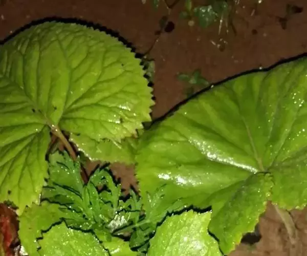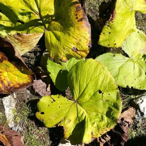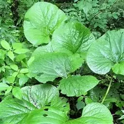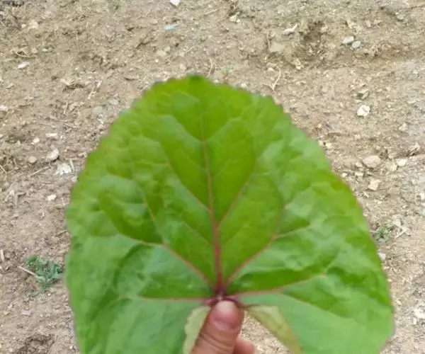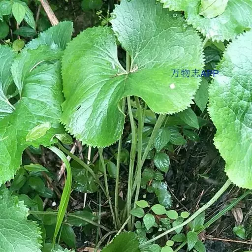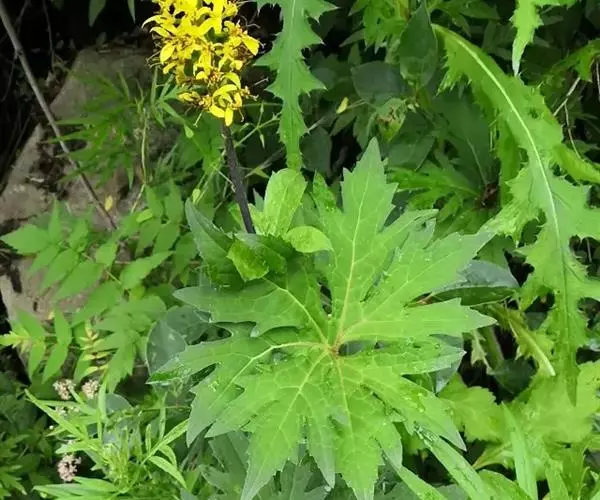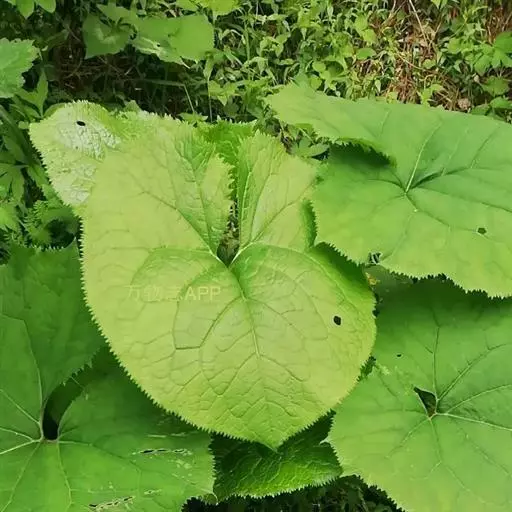丛生叶和茎下部叶具柄,柄长14-39厘米,光滑,基部鞘状,叶片卵状心形、三角状心形、肾状心形或宽心形,长3.5-2 0厘米,宽4.5-29厘米,先端圆形或钝,边缘具整齐的细齿,基部心形,弯缺长为叶片的1/3至1/4,两侧裂片长圆形或近圆形,有时具大齿,两面光滑,叶脉掌状;茎中部叶与下部者同形,具短柄,柄长3-14厘米,鞘膨大,长3-6厘米;最上部叶仅有叶鞘,鞘缘有时具齿。