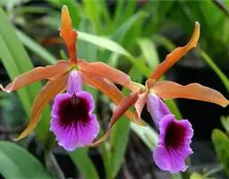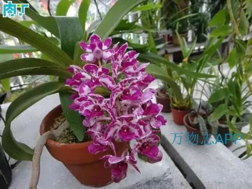 海南钻喙兰(学名:Rhynchostylis gigantea (Lindl. ) Ridl.):根肥厚,粗达10毫米。茎直立,粗壮,具数节,不分枝,具多数二列的叶,被宿存的叶鞘所包。叶肉质,彼此紧靠,宽带状,外弯。花序腋生,下垂,2-4个,通常比叶短;花白色带紫红色斑点,质地较厚,开展;萼片近相似,椭圆状长圆形;花瓣长圆形,比萼片小,先端钝,基部收狭,具5条主脉;唇瓣肉质,深紫红色,贴生在蕊柱足上,向外伸展,近倒卵形,长约17毫米,宽12毫米,基部具一对脊突,上部3裂。蒴果倒卵形,具数个棱。花期1-4月,果期2-6月。
