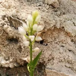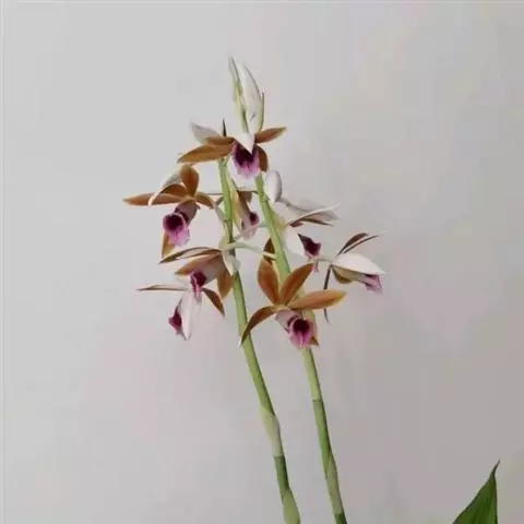 花序腋生,下垂,2-4个,通常比叶短;花序柄粗壮,长4-10厘米,粗4-7毫米,被3-4枚宽卵形的纸质鞘;花序轴粗厚,长10-20厘米,粗4-6毫米,密生许多花;花苞片通常反折,宽卵形,长约5毫米,先端钝;花白色带紫红色斑点,质地较厚,开展;萼片近相似,椭圆状长圆形,长12-17毫米,宽9-10毫米,先端钝,具5条主脉。
