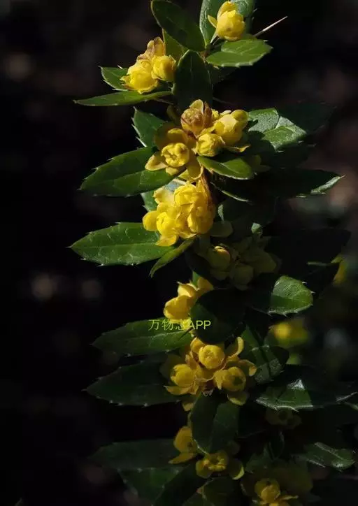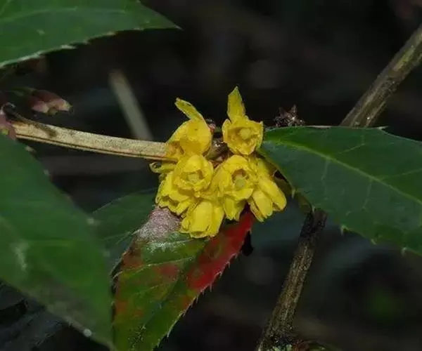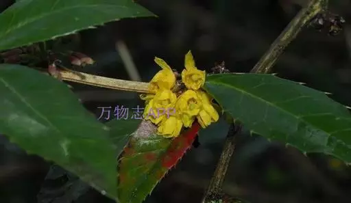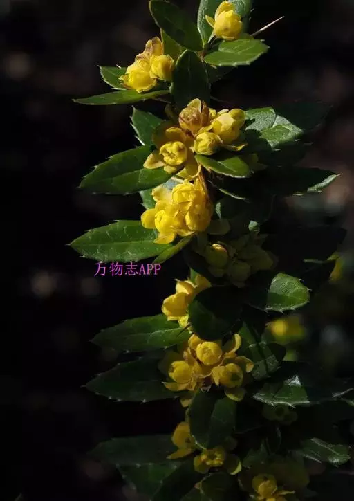 常绿灌木,高1-2米。老枝圆柱形,暗灰色,幼枝淡黄色,具棱槽及疣点;茎刺三分叉,无槽,长1.5-2厘米,与枝同色。叶革质,椭圆形、卵状长圆形、长圆状披针形至倒卵状长圆形或倒披针形,长2.5-4.5厘米,宽1-1.5厘米,先端急尖,具1刺尖头,基部楔形,上面暗绿色,中脉明显凹陷,侧脉清晰可见,背面淡绿色,中脉明显隆起,侧脉不显,两面网脉显著,不被白粉;叶缘通常平展,每边具3-8刺齿,有时具1-2刺锯齿;近无柄。花7-15朵簇生;花梗长5-12毫米;花黄色;小苞片披针形,先端渐尖,长约2.5毫米,宽约1毫米;萼片2轮,外萼片披针形或卵形,先端渐尖,长约3.5毫米,宽约2毫米,内萼片披针形或长圆状椭圆形,先端渐尖或纯,长8-9毫米,宽约3.5毫米;花瓣长圆形或长圆状倒卵形,长约4-5毫米,宽约3.2毫米,先端全缘或浅锐裂,基部楔形,具2枚分离腺体;雄蕊药隔先端微延伸,截形;胚珠2-3枚,具短柄。浆果卵状,长约9毫米,直径约5毫米,顶端具短宿存花柱,微被白粉。花期3-5月,果期8-10月。