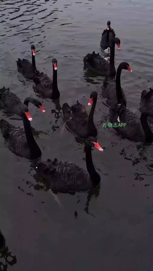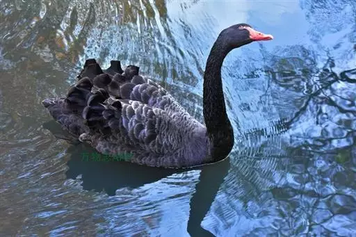 黑天鹅(学名:Cygnus atratus):是鸭科天鹅属的一种大型游禽,体长110-140厘米;翼展160-200厘米;体重3.7-8.75千克。具有天鹅种类中最长的脖子。这个细长的脖子通常呈“S”形拱起或直立。全身羽毛卷曲,体羽斑点闪烁,主要呈黑灰色或黑褐色,腹部为灰白色,飞羽为白色。尾长而分叉,外侧羽端钝而上翘形似竖琴。有一个明亮的蜡质的鸟喙,为红色或橘红色,靠近端部有一条白色横纹。虹膜为红色或白色,跗跖和蹼为黑色。共有2个亚种,指名亚种嘴较厚重。