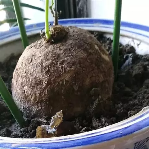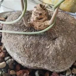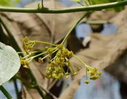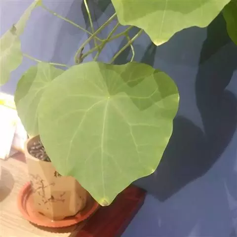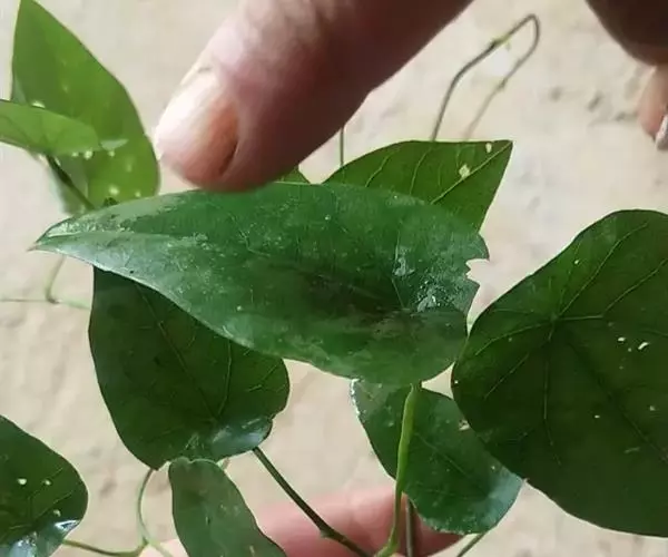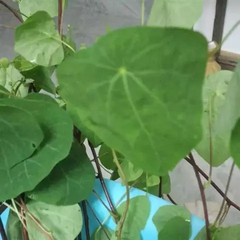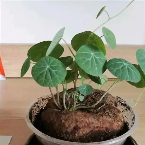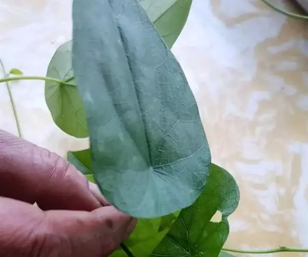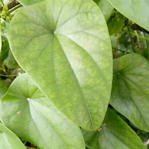 多年生藤本。茎黄褐色,有扭曲纵皱纹。叶互生,叶柄较长,盾状着生;叶片卵圆形或近宽三角形,先端锐尖,基部略凹陷或平截,粉绿色,叶脉掌状,背面带红棕色。伞形花序腋生或生于幼茎基部,花小,黄绿色;单性花,萼片、花瓣均肉质。核果。