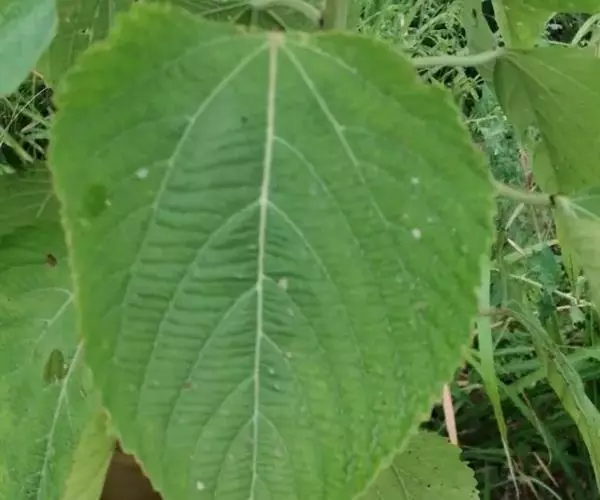 灌木或小乔木,高1.5-5米;小枝、叶柄、花序均密被白色或淡黄色长柔毛。叶纸质,卵形或卵状椭圆形,长7-14厘米,宽5-12厘米,顶端渐尖,基部圆形或近截平,稀浅心形或阔楔形,边缘具锯齿,上面被糙伏毛,下面被绒毛,叶脉上被白色长柔毛;基出脉3-5条,侧脉4-6对:近基部两侧常具褐色斑状腺体2-4个;叶柄长3-8厘米,顶端具2枚线形小托叶,长约3毫米,被毛,边缘具黄色小腺体。总状花序或下部多分枝呈圆锥花序,长15-20厘米,苞片卵形,长约2毫米;雄花3-5朵簇生于苞腋,花梗长约3毫米;花萼裂片3-5,卵形,长约2毫米,顶端渐尖;雄蕊35-60枚,花丝纤细;腺体小,棒状圆锥形;雌花1-2朵生于苞腋,苞片披针形,长约2毫米,疏生长柔毛,花梗长约3毫米;花萼裂片卵形,长约3毫米;花盘具圆齿,被毛;子房被黄色糙伏毛,花柱长1-3毫米,外反,2深裂至近基部,密生羽毛状突起。蒴果扁球形,直径6-8毫米,被柔毛。花期4-8月,果期8-10月。